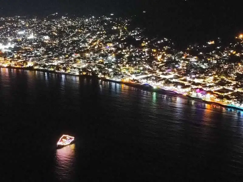 La iluminación nocturna, el sonido del mar y el ambiente del galeón crean el escenario perfecto para una noche inolvidable en Puerto Vallarta.