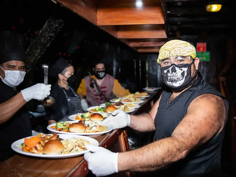 El Barco Pirata de Noche incluye una cena a bordo, ideal para disfrutar mientras navegas por la Bahía de Banderas. El ambiente nocturno, la música y el servicio hacen de este tour una excelente opción para celebrar ocasiones especiales o simplemente disfrutar de una noche diferente.